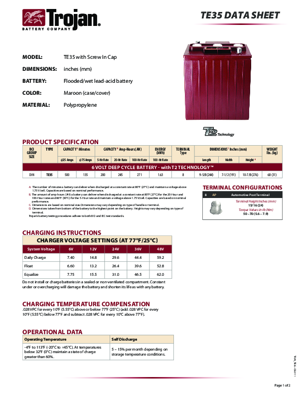 La batteria Trojan TE 35 è una scelta eccellente per chi ha bisogno di una batteria affidabile e duratura per applicazioni cicliche profonde. Grazie alle sue caratteristiche e alla sua versatilità, è in grado di soddisfare le esigenze di una vasta gamma di utenti.