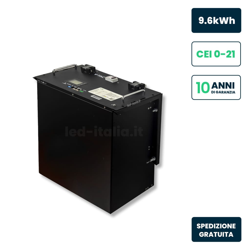 Batteria LiFePO4 con tensione nominale di 48V e capacità di 200Ah, per una riserva di energia fino a 9,6kWh.